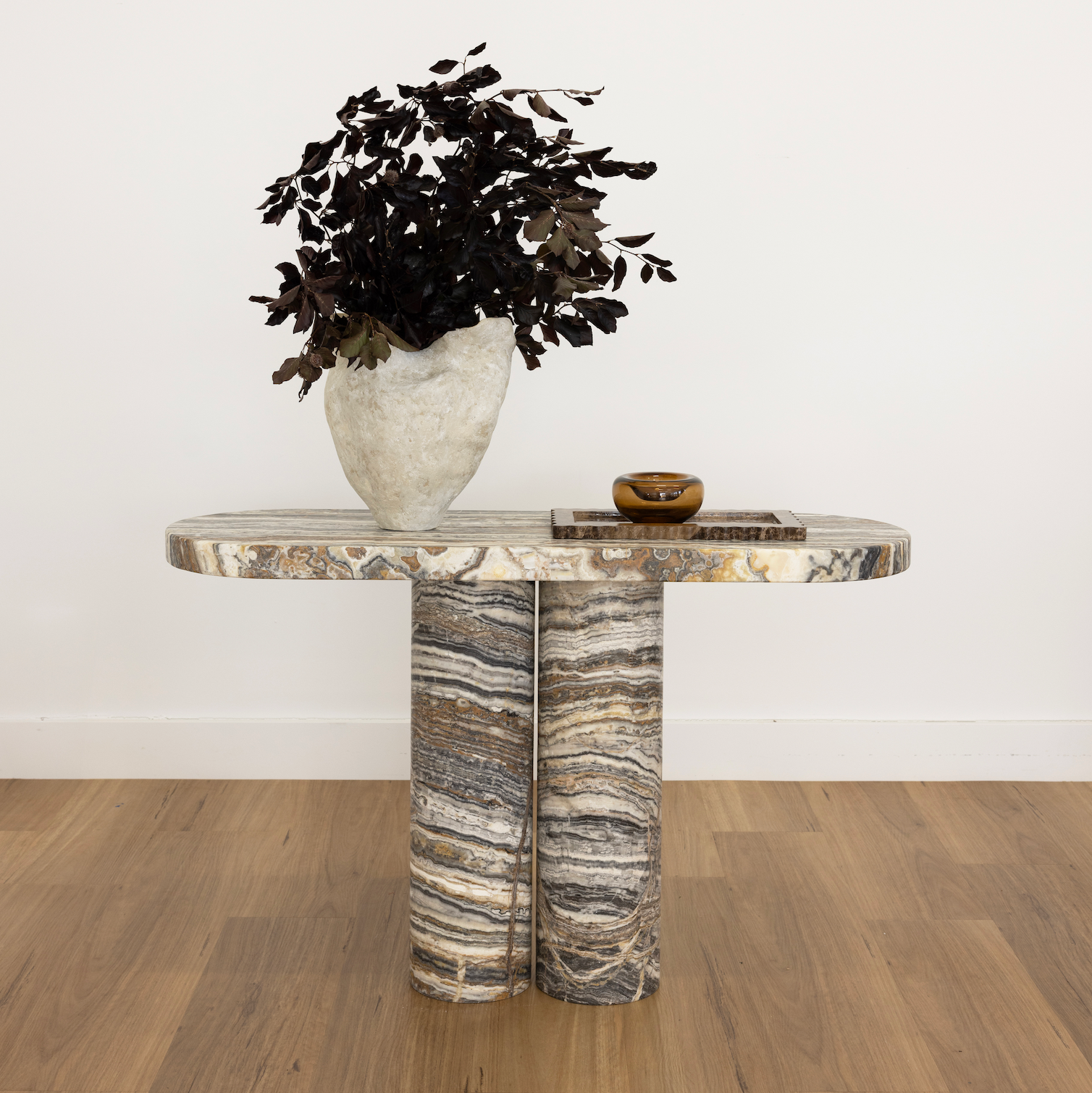 Meet Cove in Dark Tiramisu Travertine brings. The moody stone brings warmth and depth, while the curved top and twin columns keep it feeling calm and balanced. It’s the kind of piece that gets better every time you look at it.