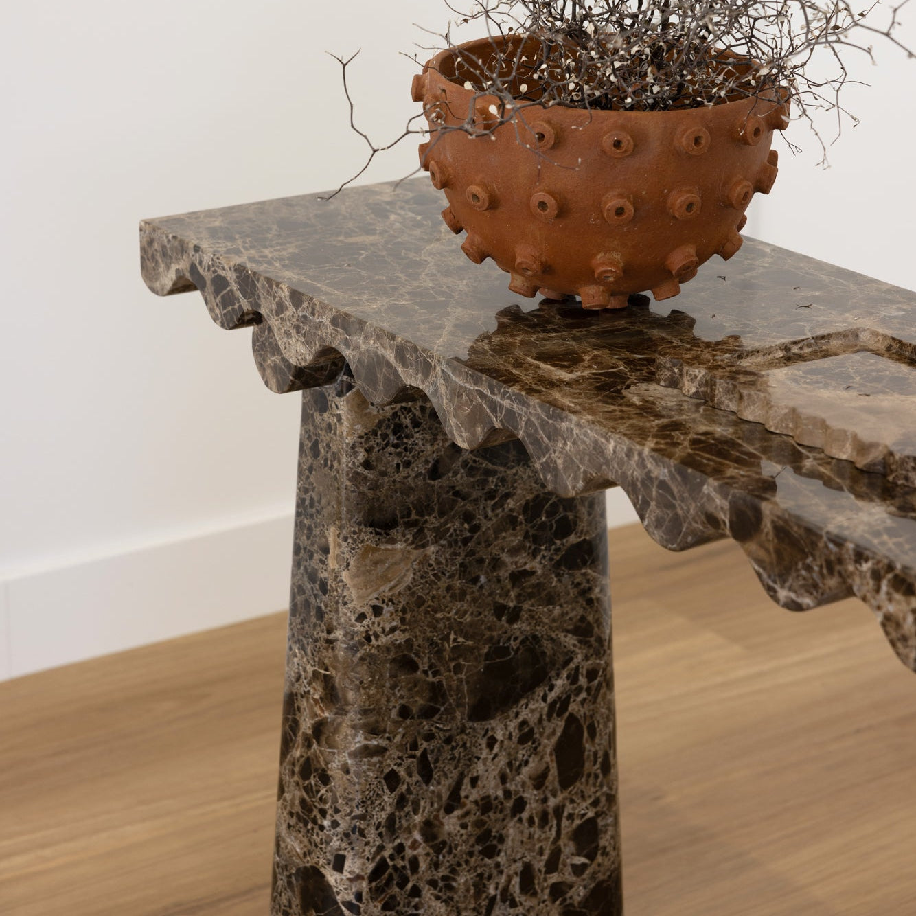 Emperador marble gives the Swell Console a richer, moodier look. The deep brown tones run along the curve in a way that feels warm and a little bit dramatic. It sits comfortably in a room and adds that touch of “something’s going on here”. Great with art, a lamp or anything you want to show off a little.